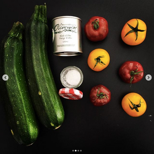 Sur une plaque allant au four, disposer les courgettes et les tomates coupées en rondelles.